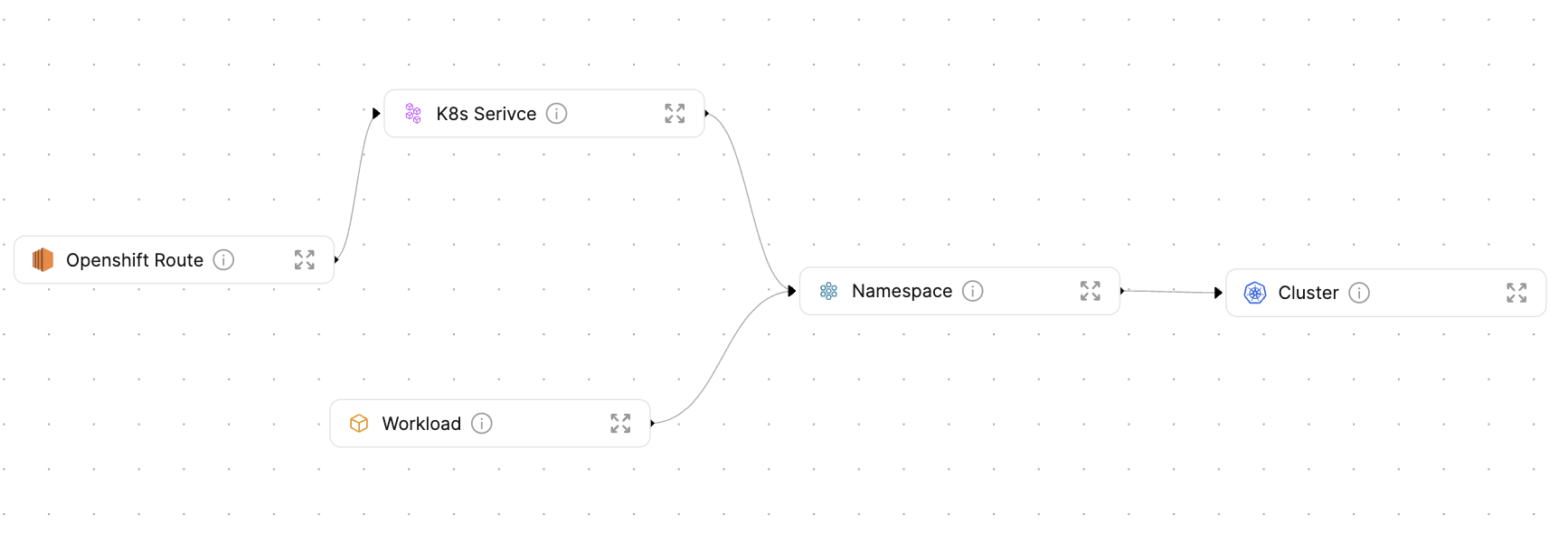 Importing your Openshift resources to Port makes it easy to create multiple tailored views for different use cases. For example, you can create a view that shows you how your Openshift cluster interacts with the rest of your infrastructure, or you can create a high-level view that allows management to understand the business value provided by your Openshift installations.