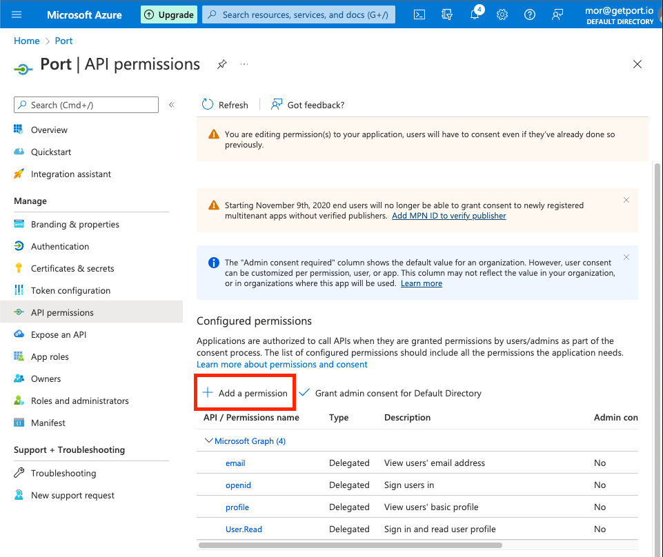 Grant admin consent: when users from your organization will first log in, they will be prompted to confirm the permissions specified here. You can click theGrant admin consent for Default Directoryto automatically approve their permissions.